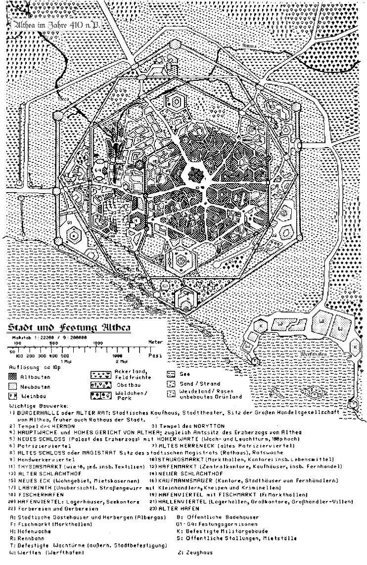 Bereits 408 machte Erzherzog Badulla die alte Handelsstadt zur Hauptstadt des neu gegründten Erzherzogtums von Althea und ließ sie anschließend in großem Umfang ausbauen. In diesem Rahmen wurde Althea auch mit einer dreifachen Festungsmauer versehen, die nun auch den Alten Hafen mit einschließt. Der Raum zwischen den Mauern der Festung wurde dort, wo die wichtigsten Fernstraßen in die Stadt kommen, zum Bau großer Karawansereien genutzt, jede mit einem eigenen Badehaus; fremde Handelskarawanen, die nach Althea kommen, sind gehalten, dort Quartier zu beziehen. Hervorragendste Gebäude der Altstadt sind der Alte Rat im Zentrum der Stadt, heute zum Städtischen Kaufhaus umgebaut, das neben den Zentralkontoren der Großen Handelsgesellschaft auch einen Theatersaal beherbergt, und das Alte Schloß, nach seiner neuen Funktion heute auch Neuer Magistrat genannt.