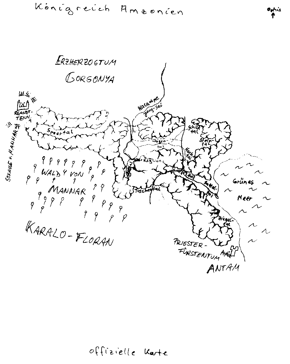 Das Reich Am'y Syrren, von den Leuten der Tiefländer auch oft Amzonien (Land der Amazonen) genannt, liegt am Oklisufer des Grünen Meeres, im sogenannten Grünen Hochland. Wie der Name schon sagt ist grün der beherrschende Farbton in dieser Region - die Pflanzen weisen kaum Farbtupfer auf, das Gestein ist überzogen von grünen Moosen und Flechten, die Fauna hat passende Tarnfarben entwickelt, und selbst die menschlichen Bewohnerinnen weisen in Haut- und Haarfarbe einen Grünton auf.