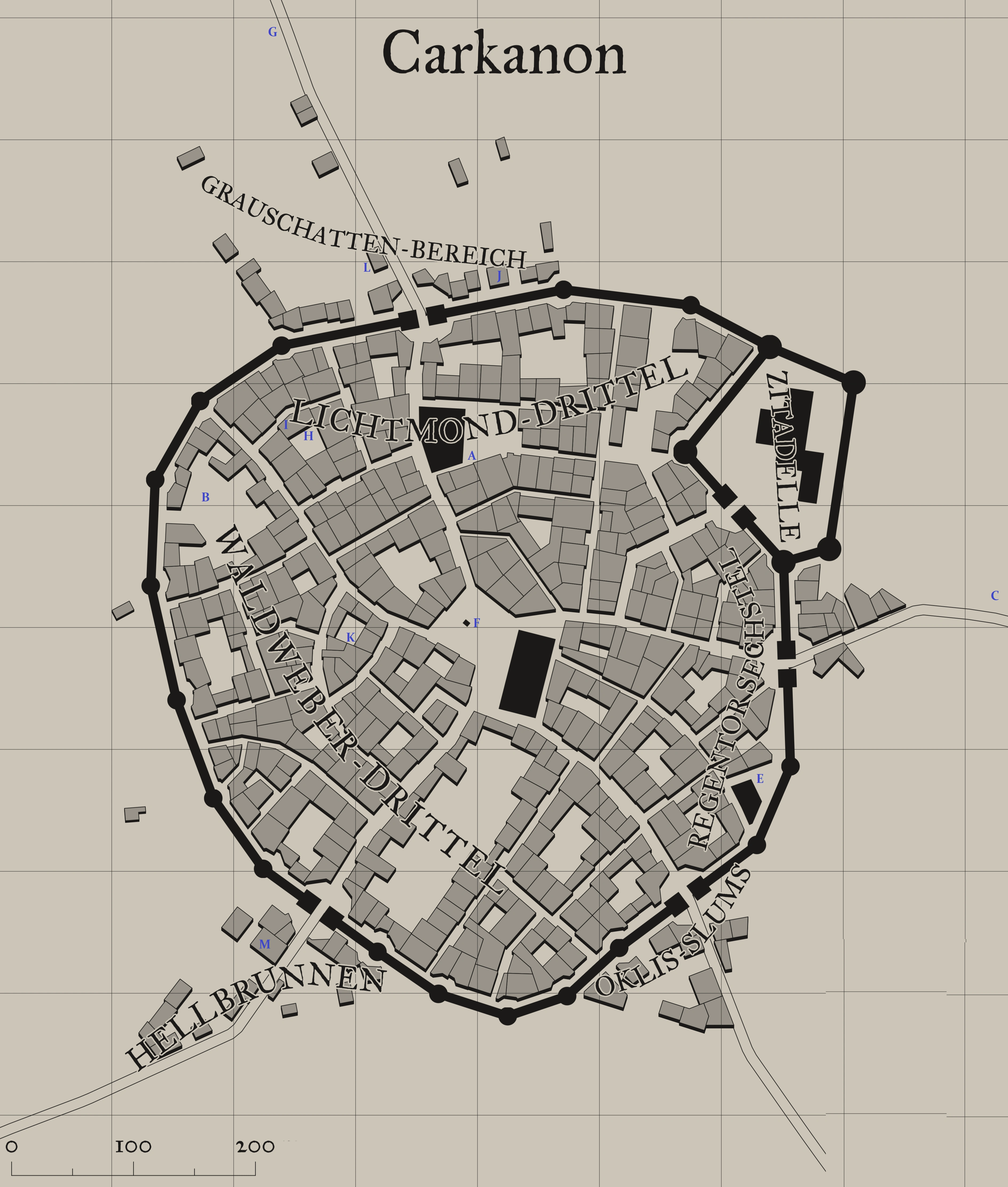 Ausserhalb der Stadtmauern liegen der Grauschatten-Bereich im Machairas, der Bereich Hellbrunnen im Lychnos und die Oklis-Slums im Oklis.