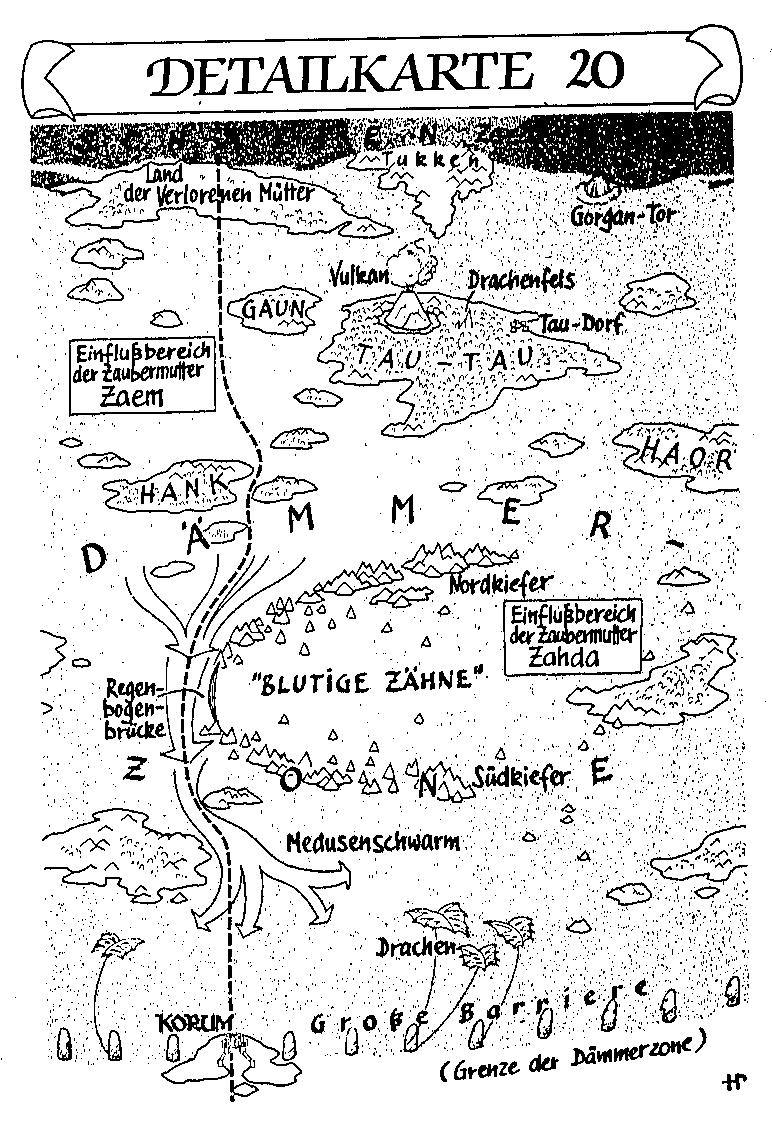 Karte der Dämmerzone der Ophiswelt an der Grenze zwischen dem Einflussbereich der Zaubermutter Zaem mit der Insel Hank und dem der Zaubermutter Zahda mit den Inseln Tau-Tau, Gaun und Haor sowie der Regenbogenbrücke und den Medusenschwarm. Gezeigt wird alles Territorium von der Schattenzone bis zur Grossen Barriere mit der Grenzstadt Korum. - Detailkarte 020 von Helmut W. Pesch aus #My56 der Mythor-Serie.