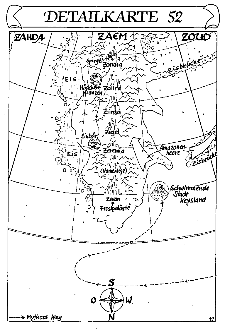 Karte der Zacke des (Schwertmonds, wo Namenlose, Schwarze Mutter, Zeremia, Zegel, Zirga), Zolira und Zonora ihre Paläste hatten am Hexenstern auf der Ophiswelt. - Detailkarte 052 von Helmut W. Pesch aus #My94 der Mythor-Serie.