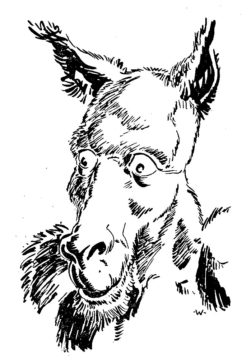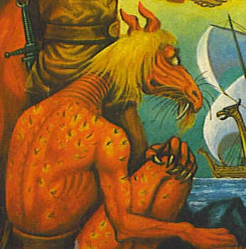 Bericht aus dem Altertum: GERREK DER MANDALER - Ein Beuteldrache und einziger seiner Art, Begleiter der Hexe Vina. männlichen Geschlechts. Seinen Namen verdankt er dem Umstand, dass er am Bauch einen Beute) (wie ein Känguruh) hat und Feuer spucken kann, doch ist er höchstens das Zerrbild eines Drachens. Mit 8 Fu8 hat er eine imposante Grösse. Die Haut ist lederartig und von purpurner Farbe, jedoch von gelblichen Schecken gesprenkelt, aus denen Büschel borstigen, geringelten und verfilzt wirkenden Haares spriessen. Der Kopf ist der einer Echse und kommt einem Drachen noch am nächsten, doch stehen die langen Knitterohren, die blonde Mähne, sowie der Kater- und der Ziegenbart von gleicher Farbe in krassem Gegensatz dazu. Die Arme sind überlang, die Hände fünffingrig. die Finger knorrig und haben starke Krallen. Die im Verhältnis zum sich nach unten birnenförmig verdickenden Körper zu kurz geratenen Beine haben übergrosse Füsse mit Fersenkrallen und vier Zehen. Ein mannslanger Schwanz wie von einer Ratte rundet diese groteske Erscheinung ab.
