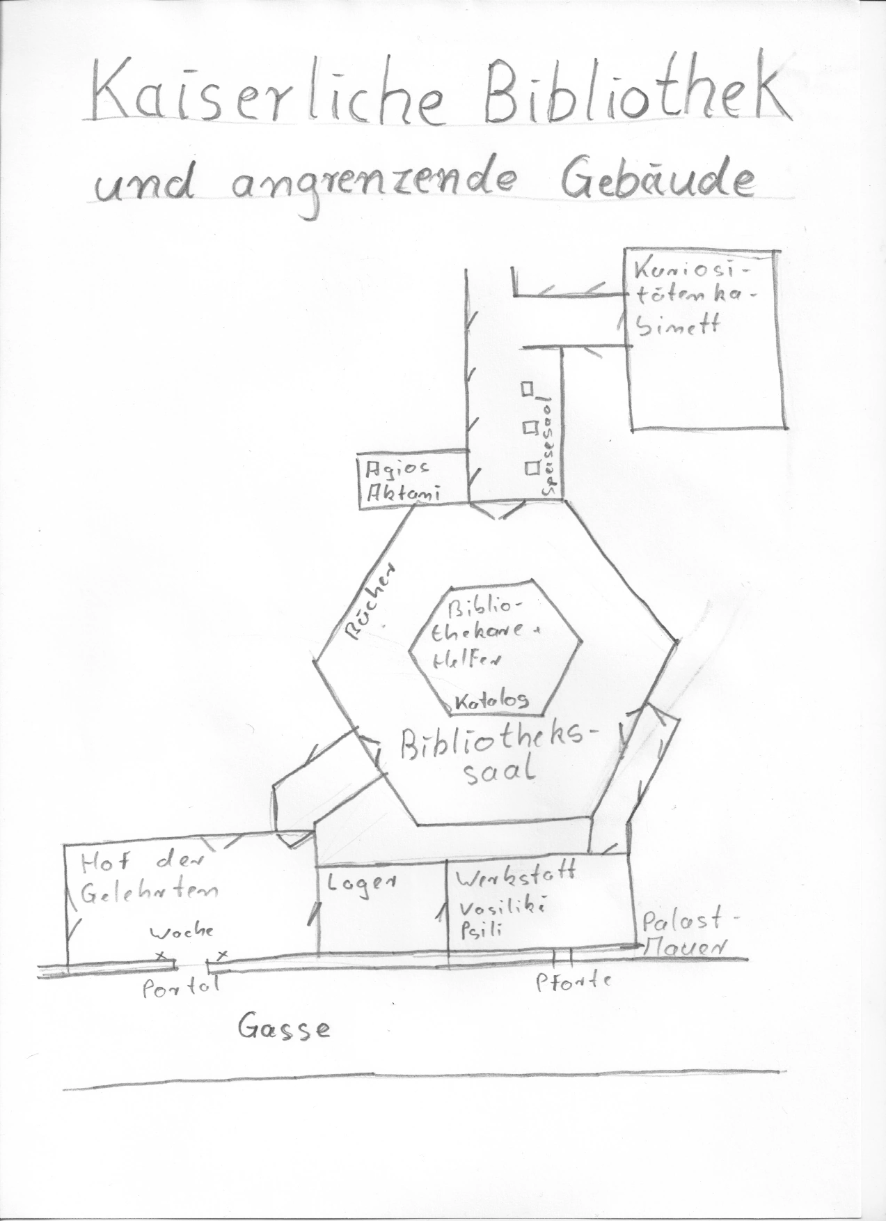 Gäste von außerhalb des Palastes erreichen die Bibliothek durch eine bewachte Pforte in der Palastmauer, welche in den viereckigen Hof der Gelehrten führt. Von hier betritt man den Büchersaal, einen großen, hohen, sechseckigen Raum, erhellt durch hochgelegene Fenster. Entlang der Wände sind gleichförmig eingebundenen Bücher in großen Regalen sortiert, Rollleitern ermöglichen den Zugriff zu den oberen Regalbrettern. Bibliothekare und Bibliothekarsgehilfen stehen bereit, verlangte Bücher hervorzuholen. Leiter der Bibliothek ist Agios Aktani, der Kaiserliche Hofbibliothekar.