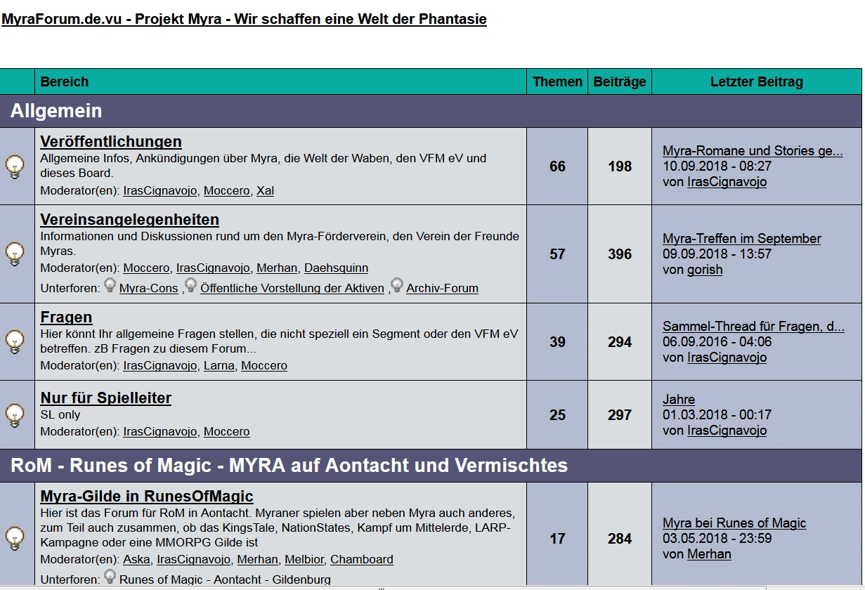 Der zentrale Platz für myranische Diskussionen und für die Veröffentlichung von Kulturbeiträgen war stets in der einen oder anderen Form das MyraForum, jetzt statt unter der .de.vu Umleitung mit direkter Adresse und vielen archivierten und immer mehr neuen Einträgen (das alte FreeBB MyraForum hatte etwa 2000 Beiträge, das Razyboard MyraForum hat über 13.000) zu finden unter