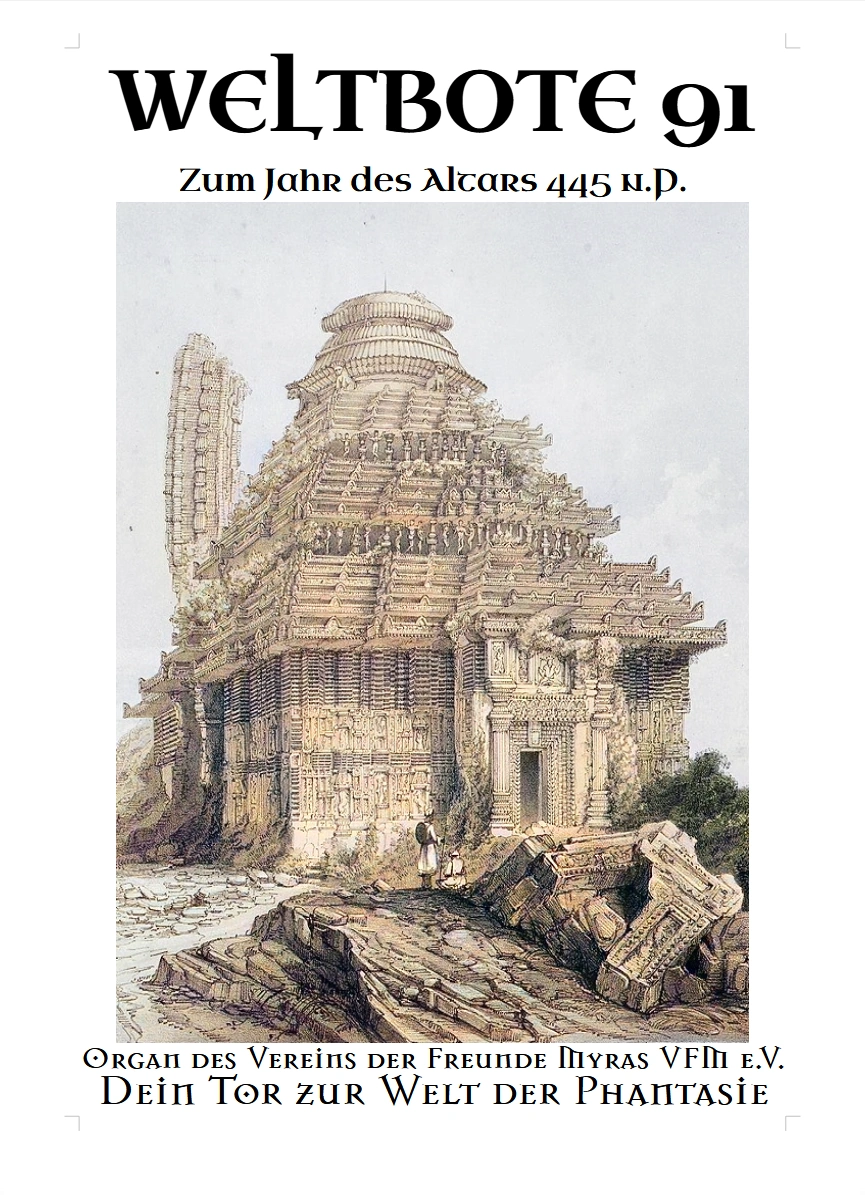 Der Myra Weltbote WB91, zum Jahr des Altars 445. Enthält Berichte und Geschehen - und Kultur von verschiedenen Gebieten Myras, von Karcanon oder Corigani über Yhllgord bis zum Verein der Freunde Myras VFM e.V..