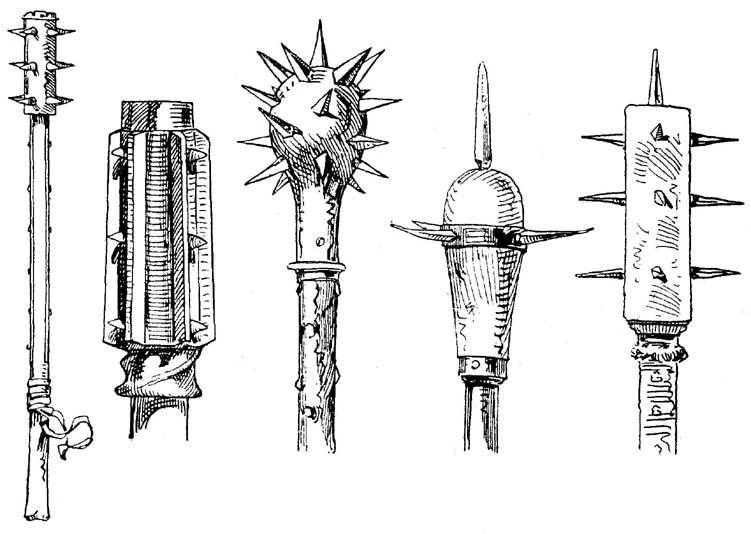 Keule, Morgenstern (-> Abb. unten), Streitkolben (-> Abb. drunter), Hammer, Nunchaku, Stäbe, Schilde, umgekehrt geschwungenes Schwert = Schlag mit Parierstange, u.ä. In einigen Rollenspielsystemen lassen sich z.B. bei Skeletten nur mit diesen Waffen voller Schaden erzielen, mit Stich- & Klingenwaffen lediglich halber Schaden.