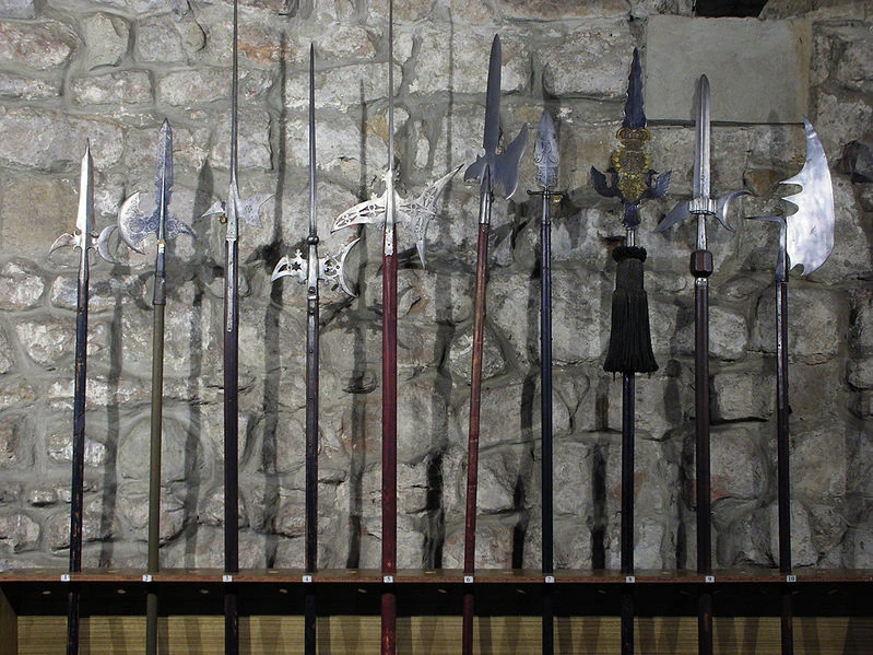 Rüstungsbrechende Waffen mit Spitze, z.B. Rabenschnabel, spitze Seite der Hellebarde