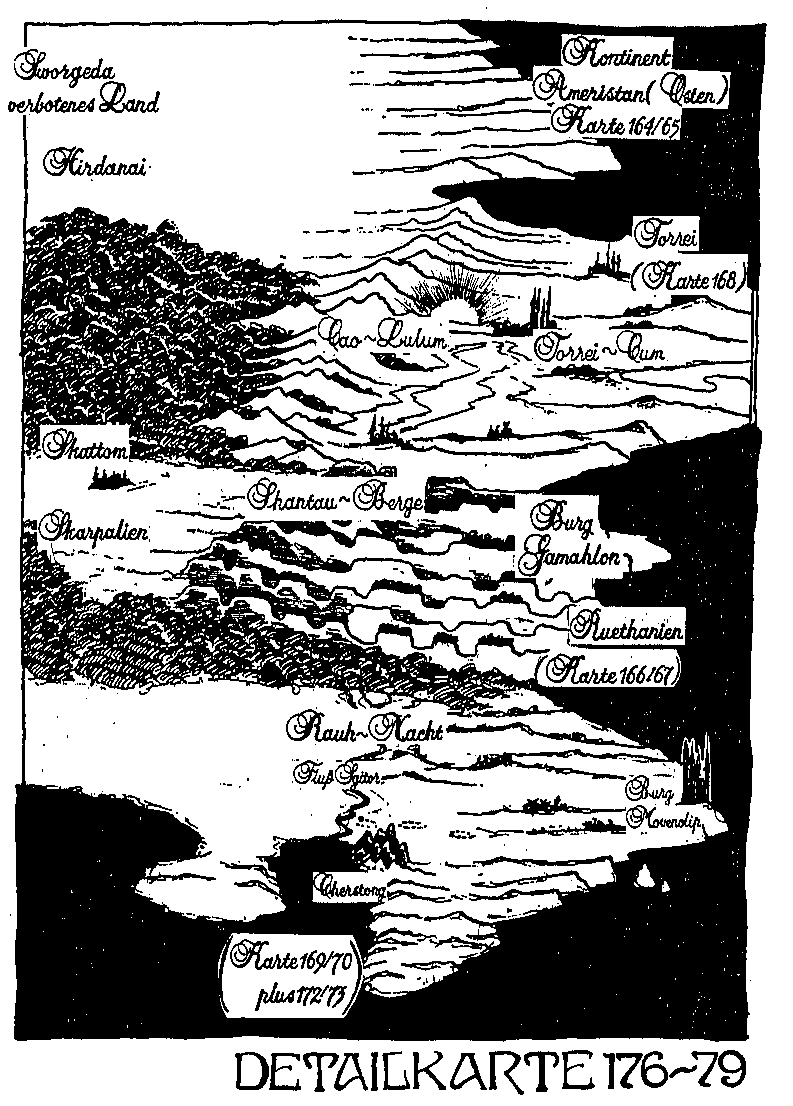 Karte von Amerstan (Yhllgord) nach Allumeddon zum Beginn des Dunklen Zeitalters. Zeigt die Lage des Verbotenen Landes Sworgeda und Hirdanai, von Torrei und Cao-Lulum, Skattom und Skarpalien, die Shantau-Berge und Ruethanien, Rauhnacht sowie die am Fluss Sgitor gelegene Festung Cherstong. - Detailkarte 176-179 von Klaus Schiemann aus #My176, My177, My178 und My179 der Mythor-Serie. - Hier: FairUse